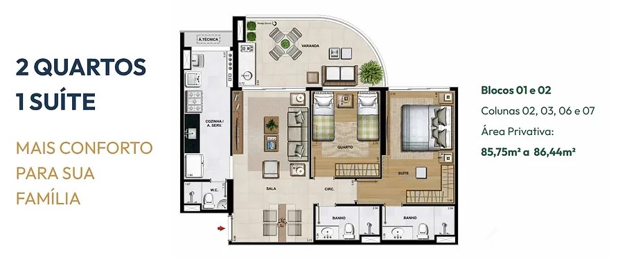 PLANTA EXCLUSIVA - Apartamentos de 2, 3 e 4 quartos bem espaçosos entre 86m² e 126m² e com lindos decorados para visitar.